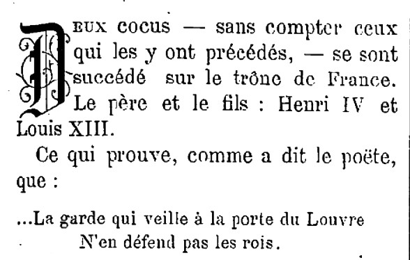 «On a fait grand bruit dernièrement de la prétendue découverte d’un peuple qui prend plaisir à se crever un œil pour y voir plus clair de l’autre, suivant ce que disent les bonnes gens qui n’y voient goute. Ce peuple singulier est connu depuis longtemps, et pour le prouver je traduis ce passage du journal d’un voyageur portugais, mort il y a plus d’un siècle ; le nom de cet explorateur des îles de la mer du Sud était Palmaleyra ; son livre a été traduit par le célèbre compilateur Barbaloue, et imprimé en 1729, chez Typhaine, rue des Rats, à la belle image. Je copie servilement la prose de Barbaloue.