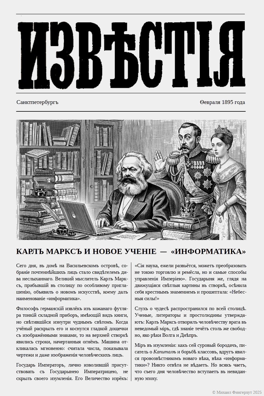 Today, in a house on Vasilievsky Island, a gathering of the most respectable figures witnessed an unheard-of marvel. The great thinker Karl Marx, having arrived in the capital by special invitation, announced a new art, which he named “informatics.”