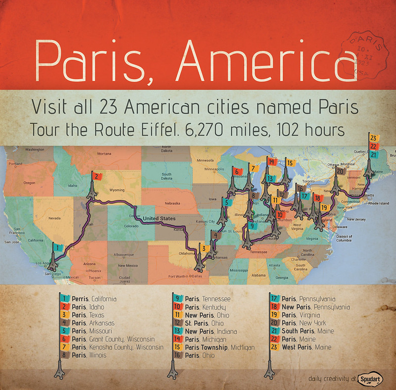 Back to our side — have a dip in Lake Chargoggagoggmanchauggagoggchaubunagungamaugg (Mass., US), and then go visit Truth or Consequences (New Mexico), a dramatically named but perfectly ordinary town, followed by the occasional American Paris — Paris (TX), Paris (KY), Paris (TN), Paris (IL), Paris (ME), Paris (AK), Paris (MI), Paris (ID), and others.