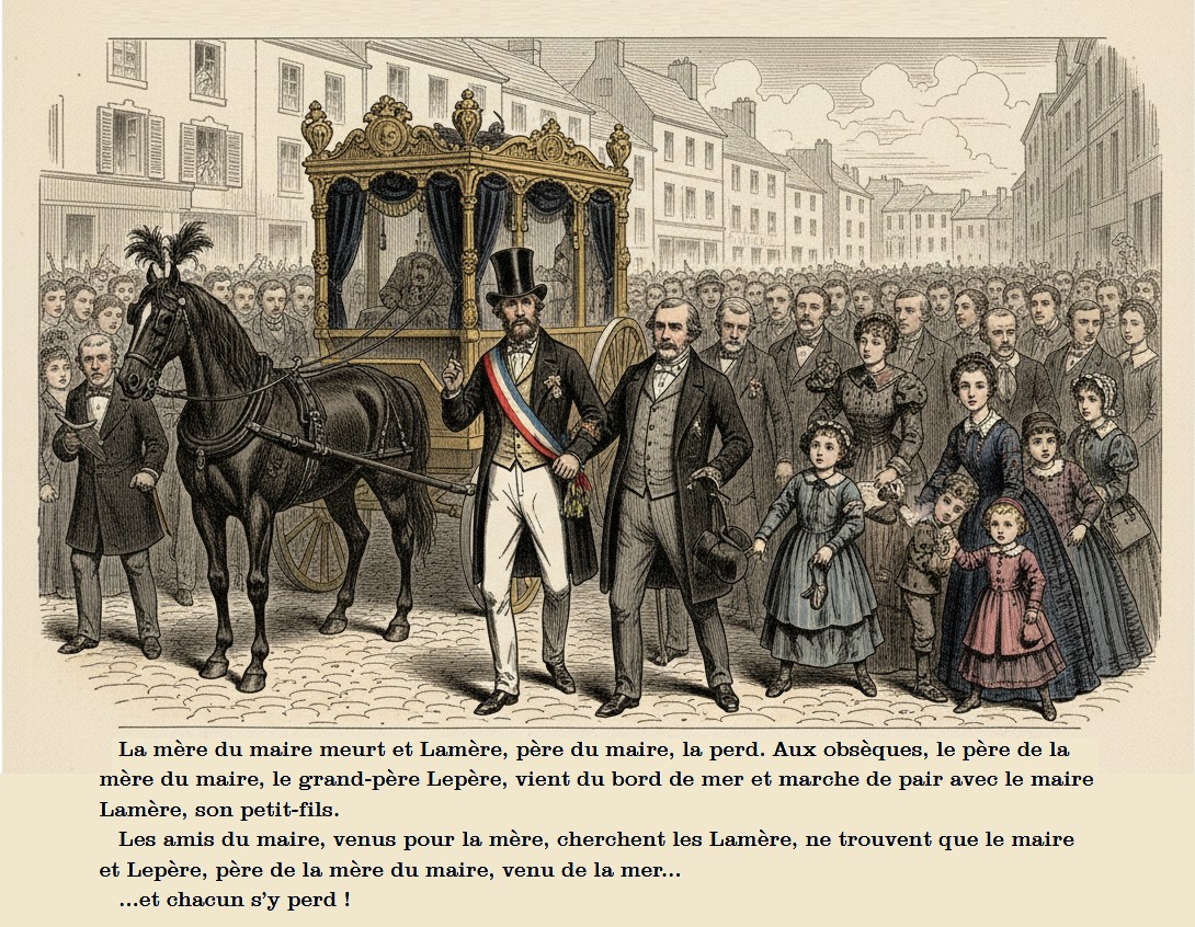 Aux obsèques, le père de la mère du maire, le grand-père Lepère, vient du bord de mer, et marche de pair avec le maire Lamère, son petit-fils. Les amis du maire, venus pour la mère, »cherchent les Lamère, ne trouvent que le maire et Lepère, père de la mère du maire, venu de la mer, et chacun s’y perd !