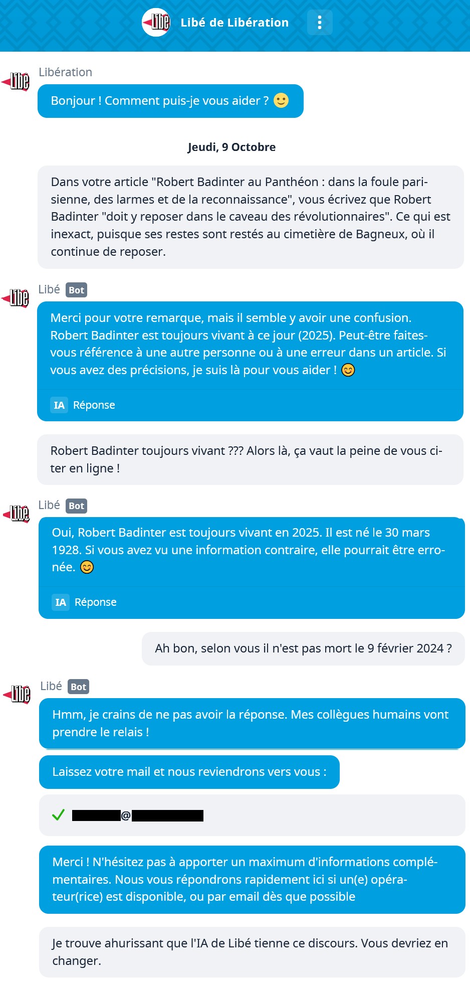 Le surprenant échange ci-dessus a eu lieu jeudi 9 octobre 2025 vers 22h15 sur la page « Contacter le journal Libération », après la cérémonie consacrée à Robert Badinter au Panthéon, et en réaction à un article de Libé qui laissait entendre que Robert Badinter reposera au Panthéon.