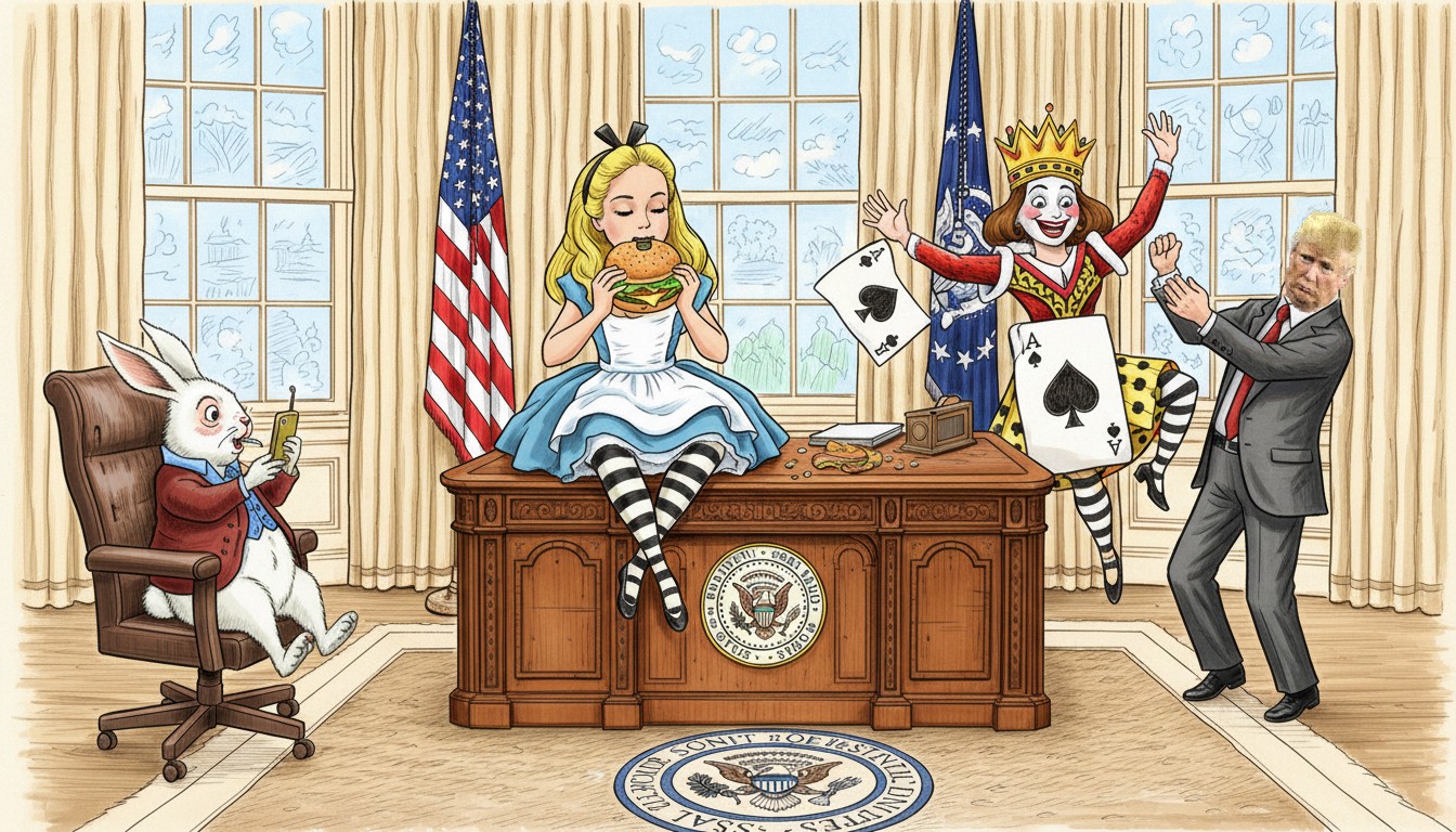 It was a most curious gathering in the Oval Room: Alice, the White Rabbit, and the Queen of Spades—each with their own unique sense of style and flair. Alice, naturally, was served a hamburger—perhaps because the President knew she had an endless appetite for adventure, but not for tea. The White Rabbit, in a clear nod to his busy schedule, was handed a cell phone to check the time—though he kept muttering, “I’m late, I’m late!” as he fiddled with it, trying to find the charger.