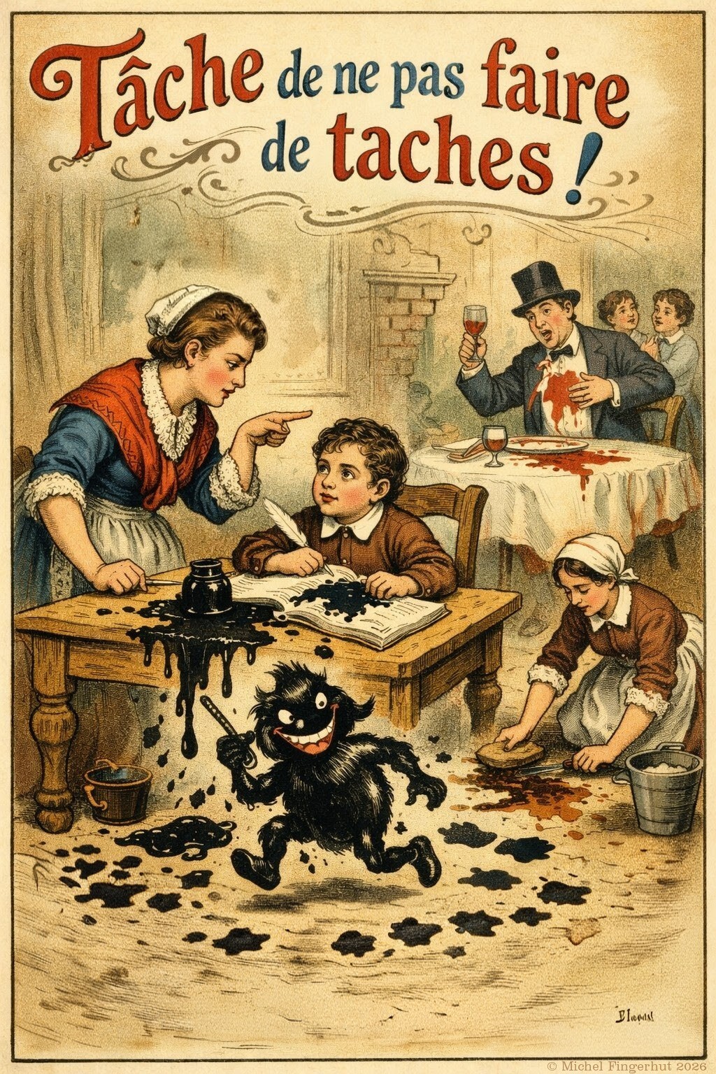 Une tache de vin rouge s’étale sur la nappe, Quelle ingrate corvée, quelle pénible tâche ! Je frotte, je récure, et pourtant rien n’échappe — Le souvenir de la fête à ce tissu s’attache.